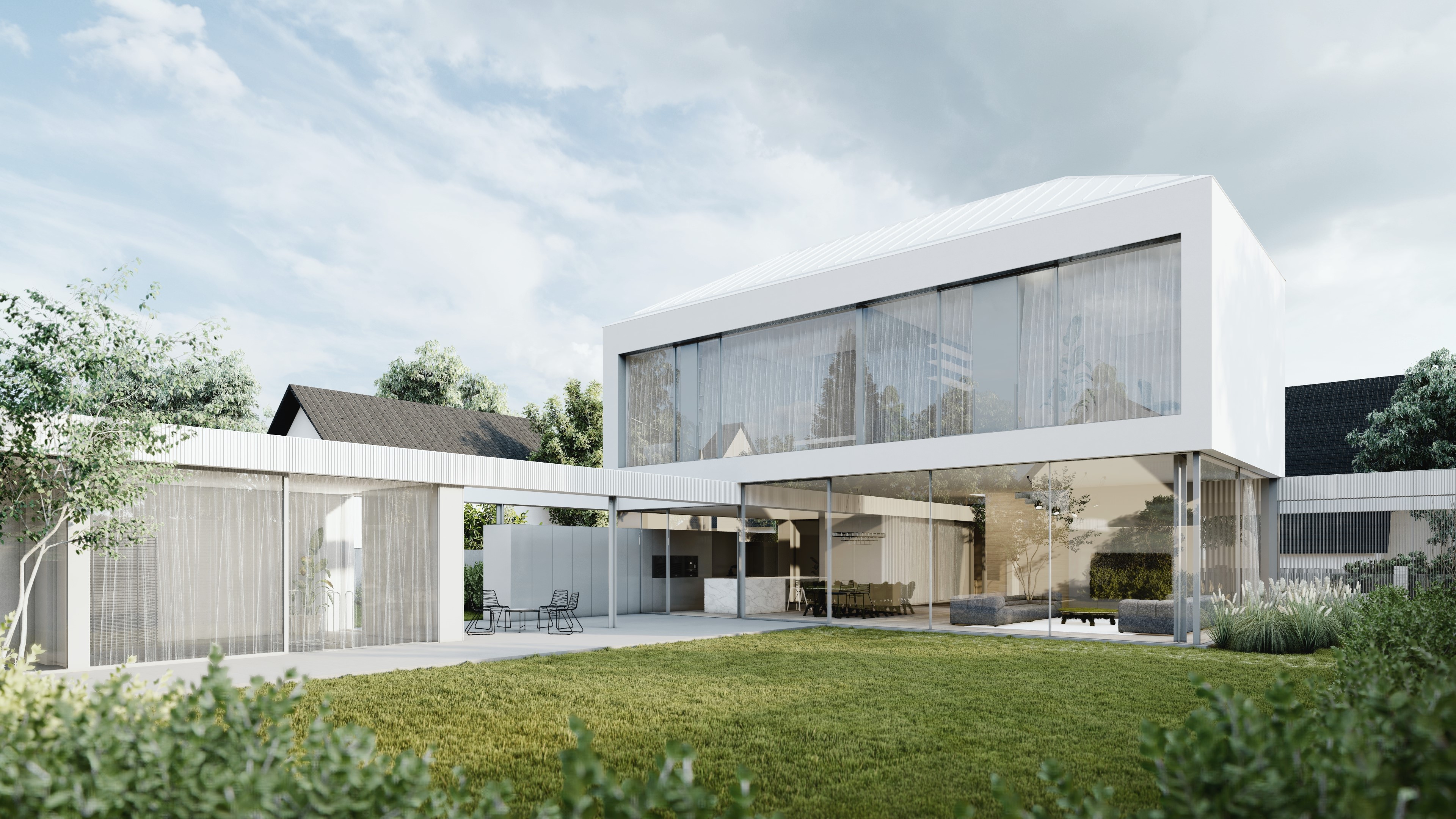 Integrace skleněných stěn do architektonicky čistých bílých fasád