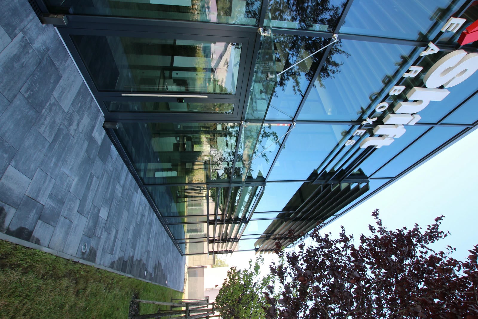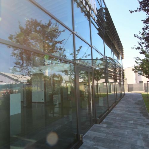Součástí námi dodávané prosklené fasády bylo zasklení protislunečním sklem typu Cool-lite SKN 183. Velkoformátové zasklení vyžadovalo speciální zesílenou konstrukci rastru fasády. Kromě protislunečního zasklení je část fasády ochráněna hliníkovým vertikálním slunolamem o průřezu 250 mm.