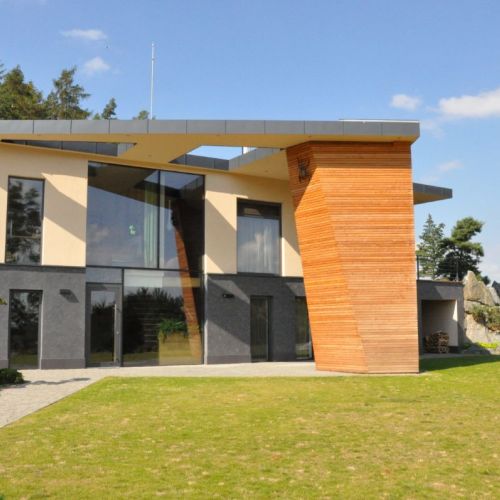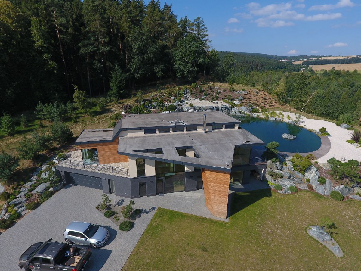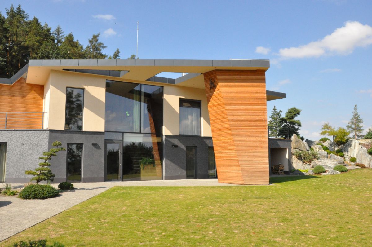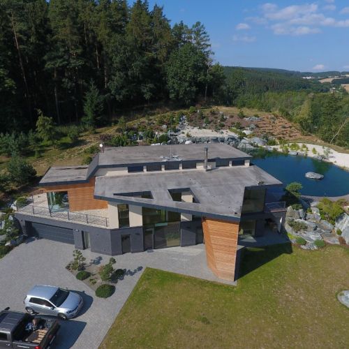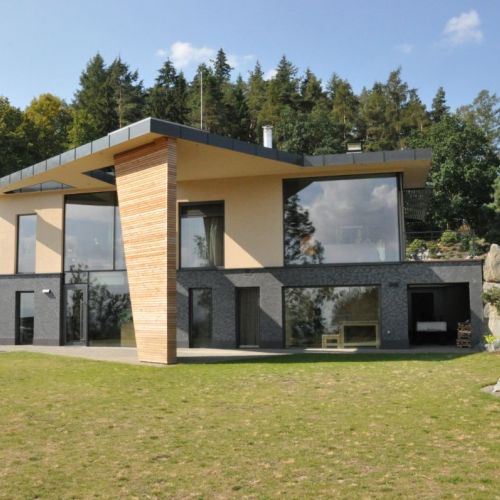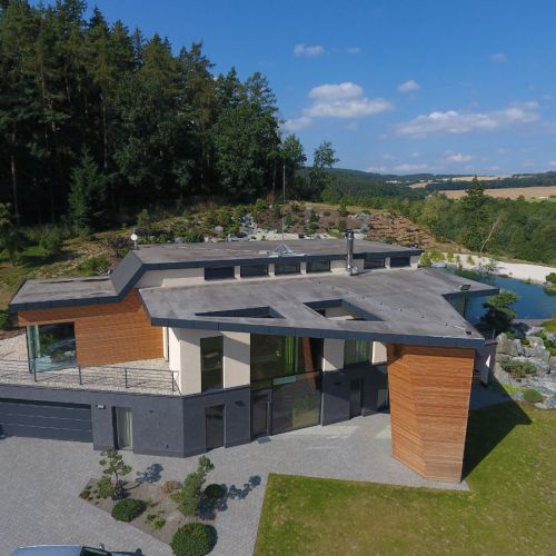 Tento netradiční rodinný dům se nachází v malé obci v blízkosti Olomouce a je zasazen do svahovitého pozemku, na němž bylo kromě rodinného domu vybudováno i rozsáhlé jezírko o objemu cca 1200 m3. Otvorové výplně a jejich technické řešení, které jsme na tuto stavbu dodávali, byly individuálně upraveny pro potřeby tohoto projektu.