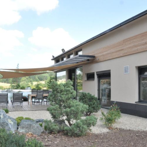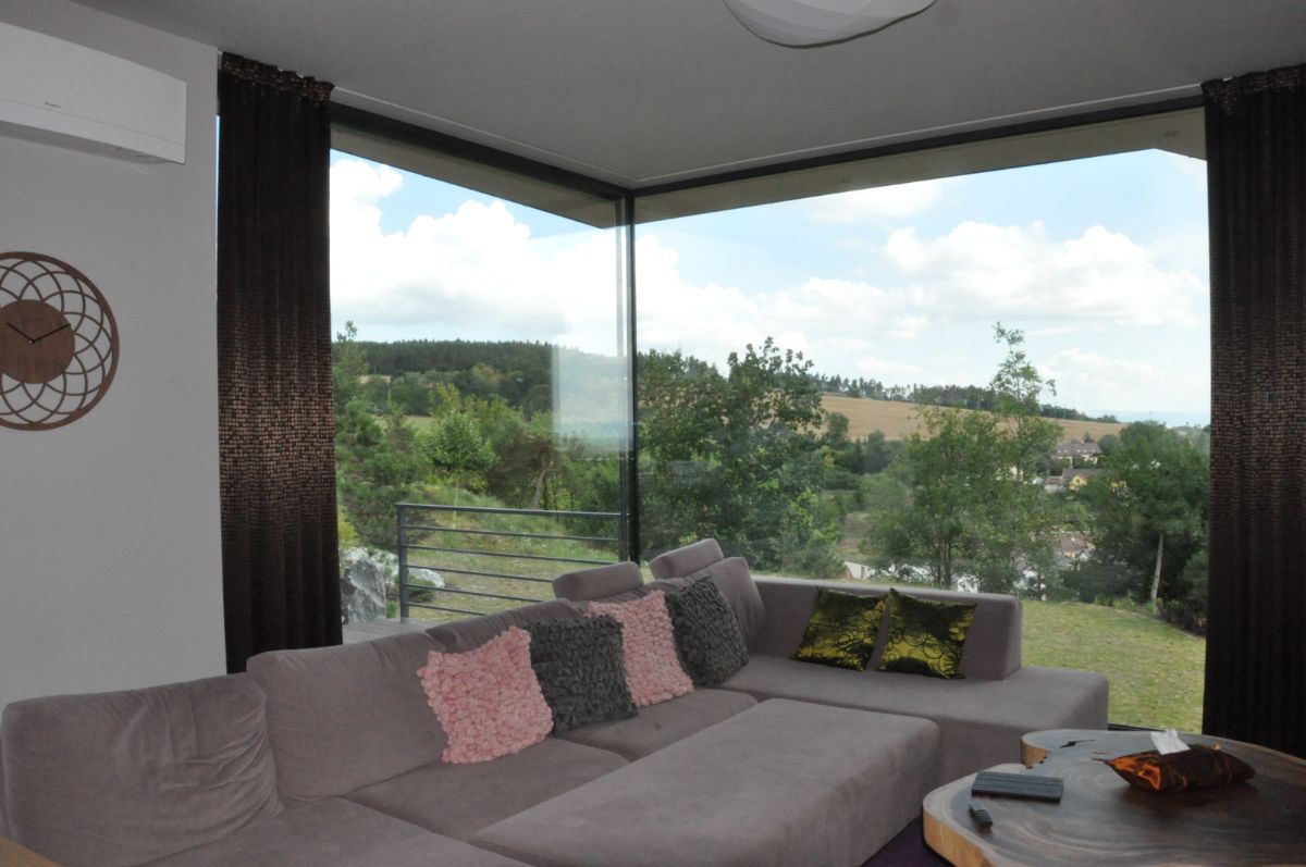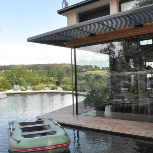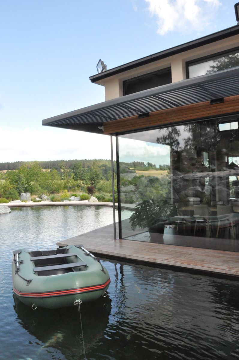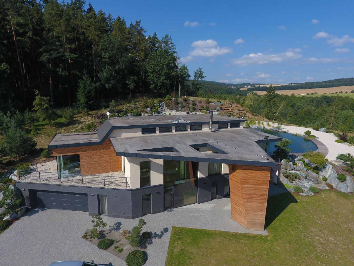 Tento netradiční rodinný dům se nachází v malé obci v blízkosti Olomouce a je zasazen do svahovitého pozemku, na němž bylo kromě rodinného domu vybudováno i rozsáhlé jezírko o objemu cca 1200 m3. Otvorové výplně a jejich technické řešení, které jsme na tuto stavbu dodávali, byly individuálně upraveny pro potřeby tohoto projektu.