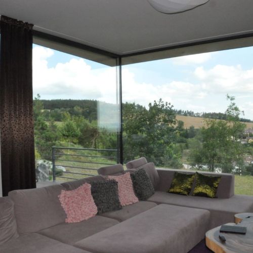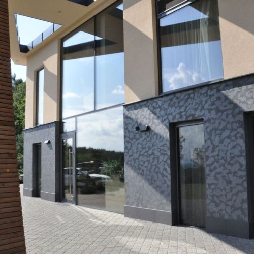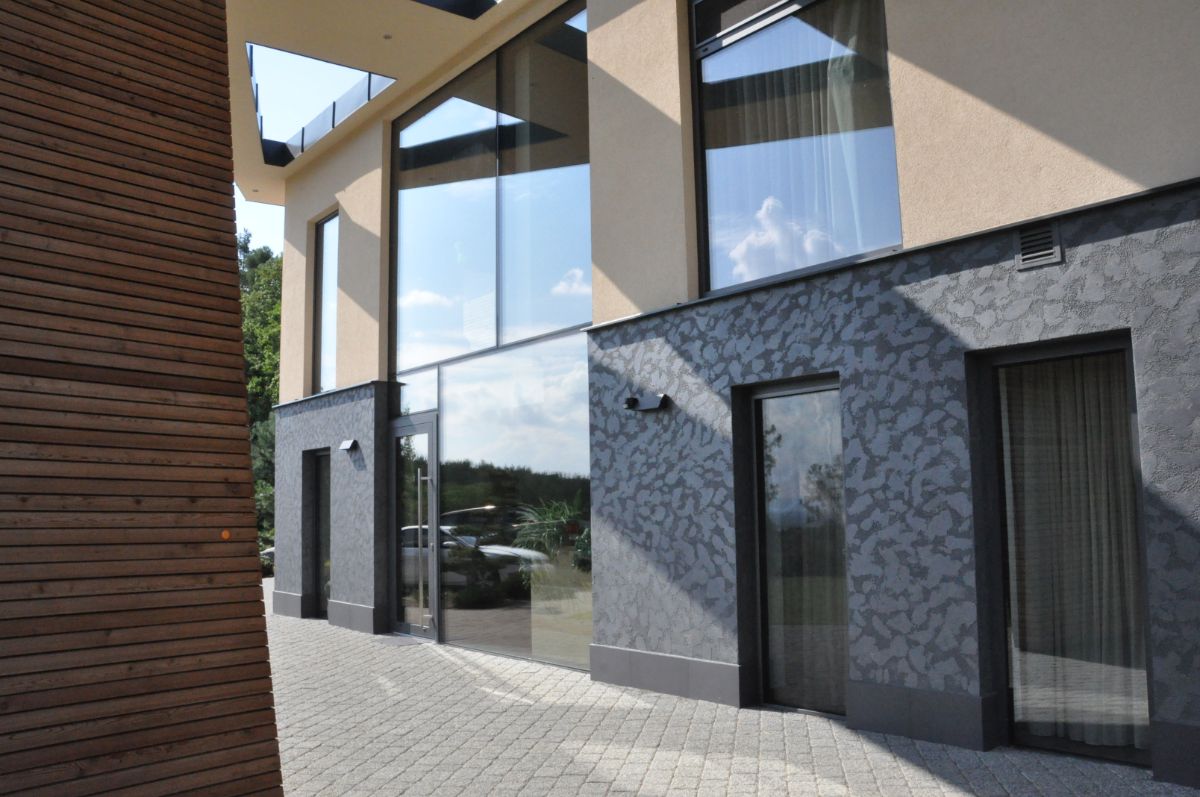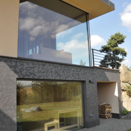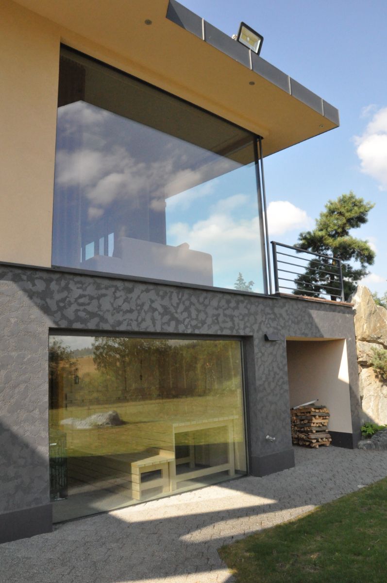 Proto bylo použito několik rozdílných systémů, abychom naplnili nejrůznější požadavky investora. Například vstupní stěna do domu je netradičně řešena pomocí sloupko-příčkového fasádního systému MB-SR50N EFEKT s tzv. strukturálním zasklením, kdy fasáda vytváří celoskleněný vzhled. Většina ostatních výplní je tvořena naopak z rámového systému ALUPROF MB-86SI s velkoformátovými izolačními trojskly se strukturálními spoji rohových oken. Váha těchto skel se pohybovala mezi 600 - 800 kg a zasklívání probíhalo pomocí speciálních manipulátorů.