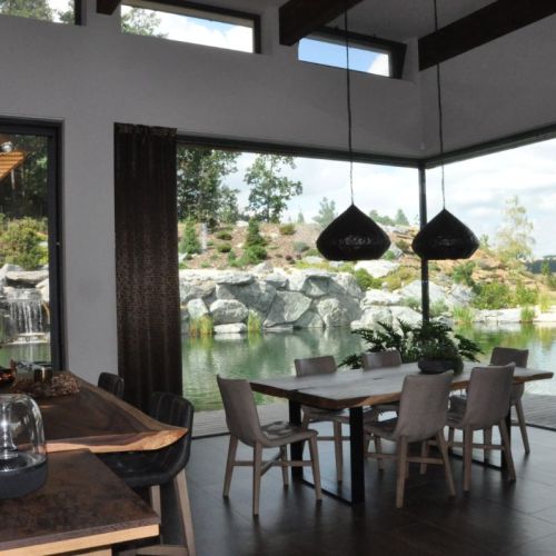 Pro přechod mezi interiérem a exteriérem bylo využito především zdvižně-posuvných dveří ALUPROF MB-77 HS HI, které umožňují pohodlný přístup na terasu nebo zahradu.