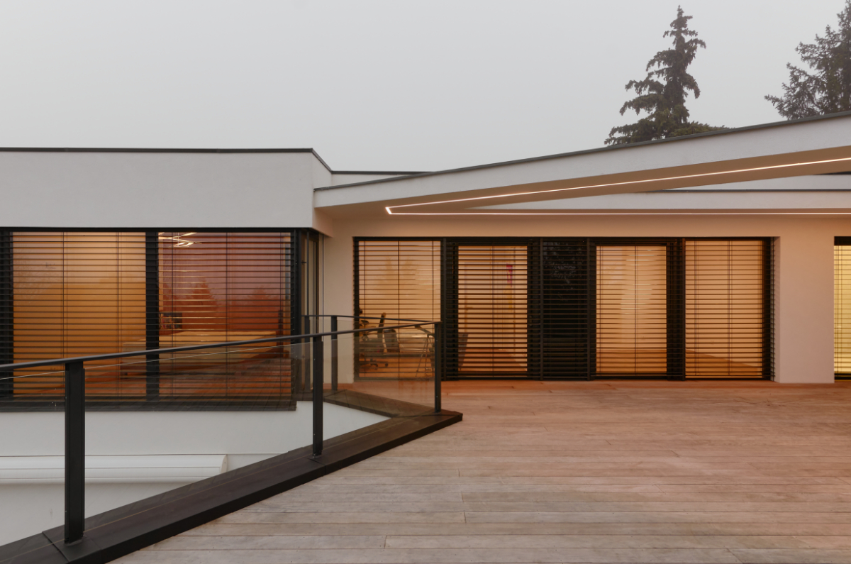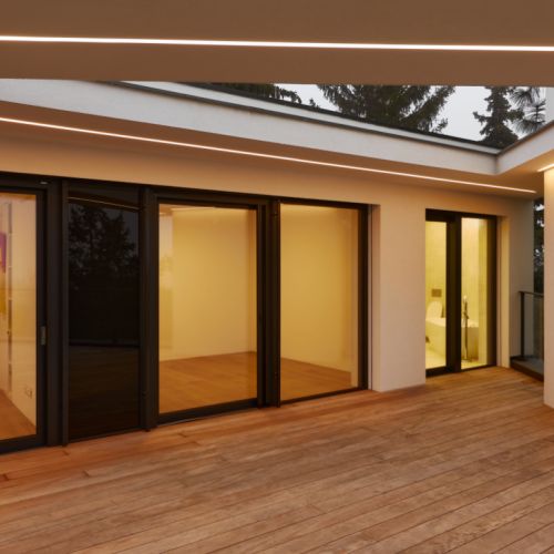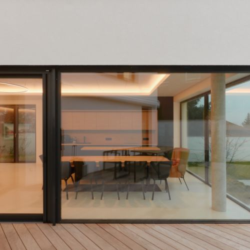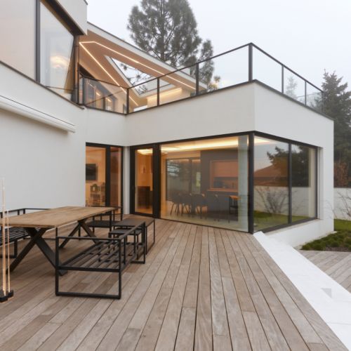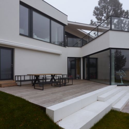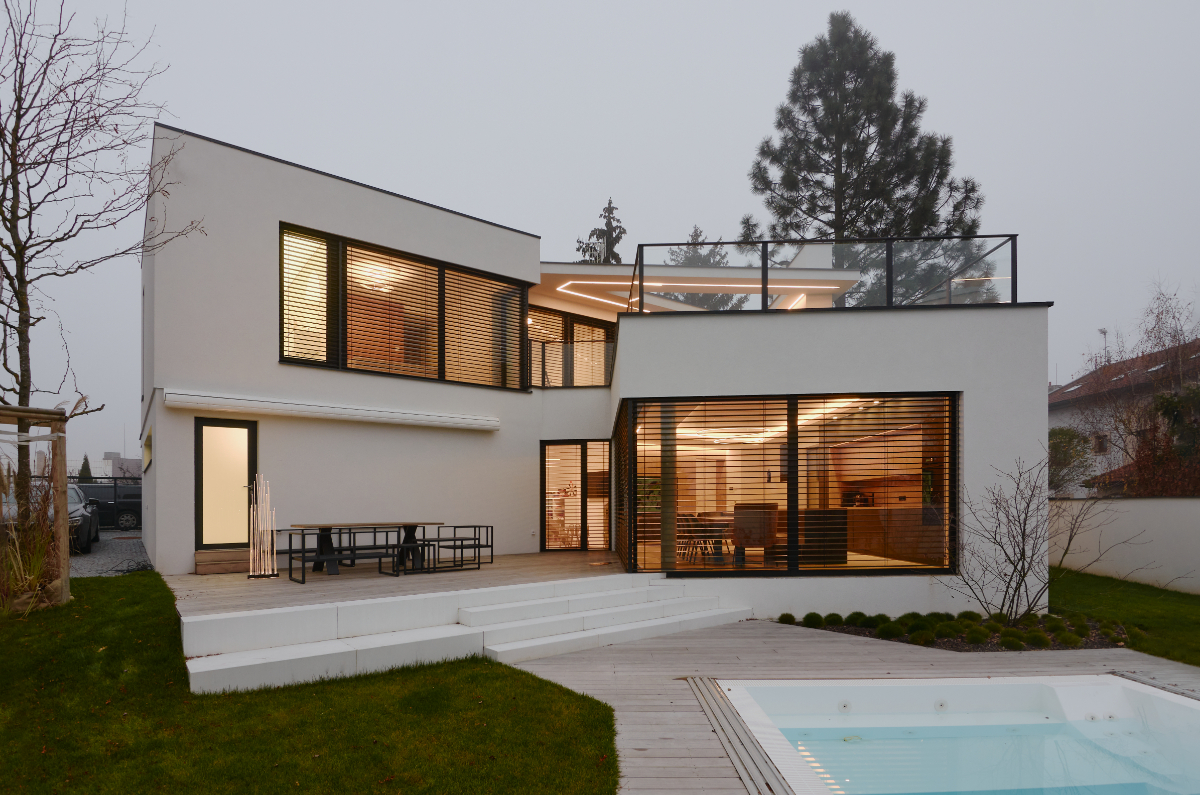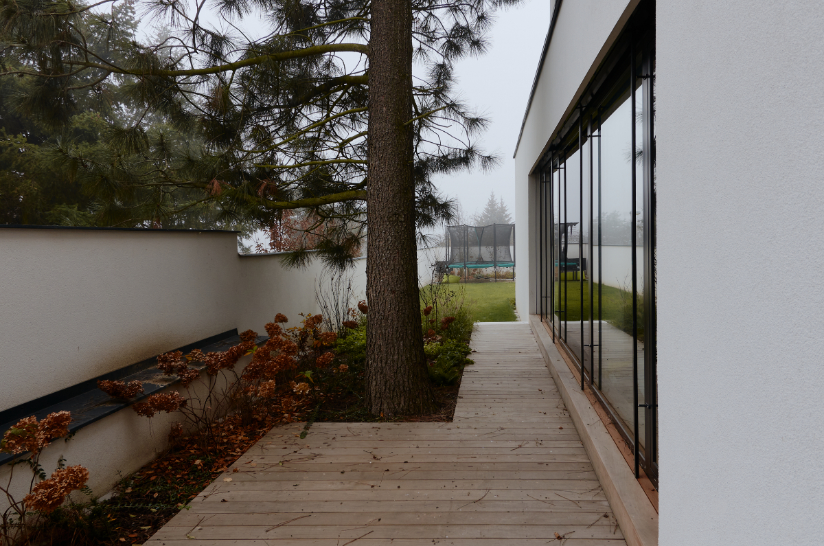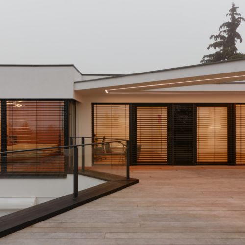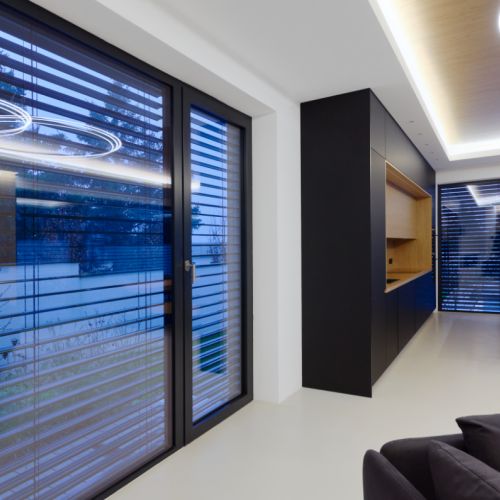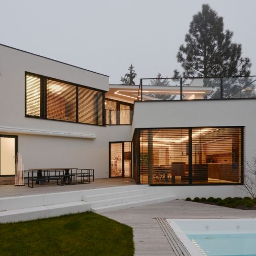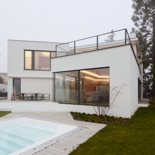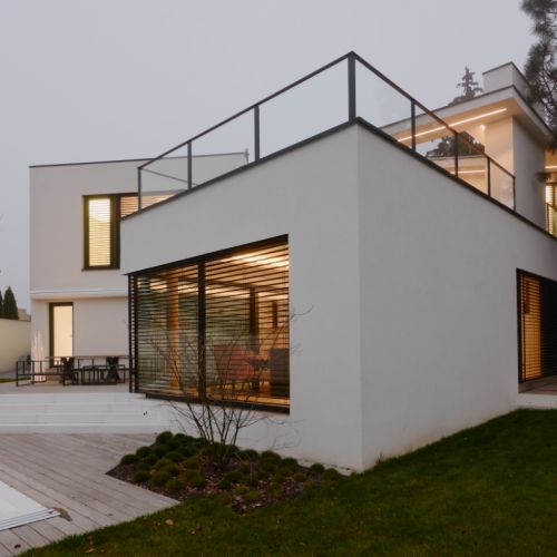 Moderní dvoupodlažní vila na rohové parcele v původní zástavbě Dolních Počernic navržená studiem Kareš&Rais. Na vile jsou kombinovány všechny moderní systémy ALUPROF, které se používájí pro rodinnou výstavbu v nízkoenergetickém standardu. Okna jsou vyrobeny z kvalitních, vysoce izolačních rámů MB-86SI v kombinaci s bezpečnostním izolačním trojsklem. S důrazem na design a ničím nerušený výhled ven byly okenní rámy v obývací části minimalizovány a částečně skryty. Všechny výplně jsou v exteriéru osazeny venkovními žaluziemi CLIMAX Z-90 NOVAL.