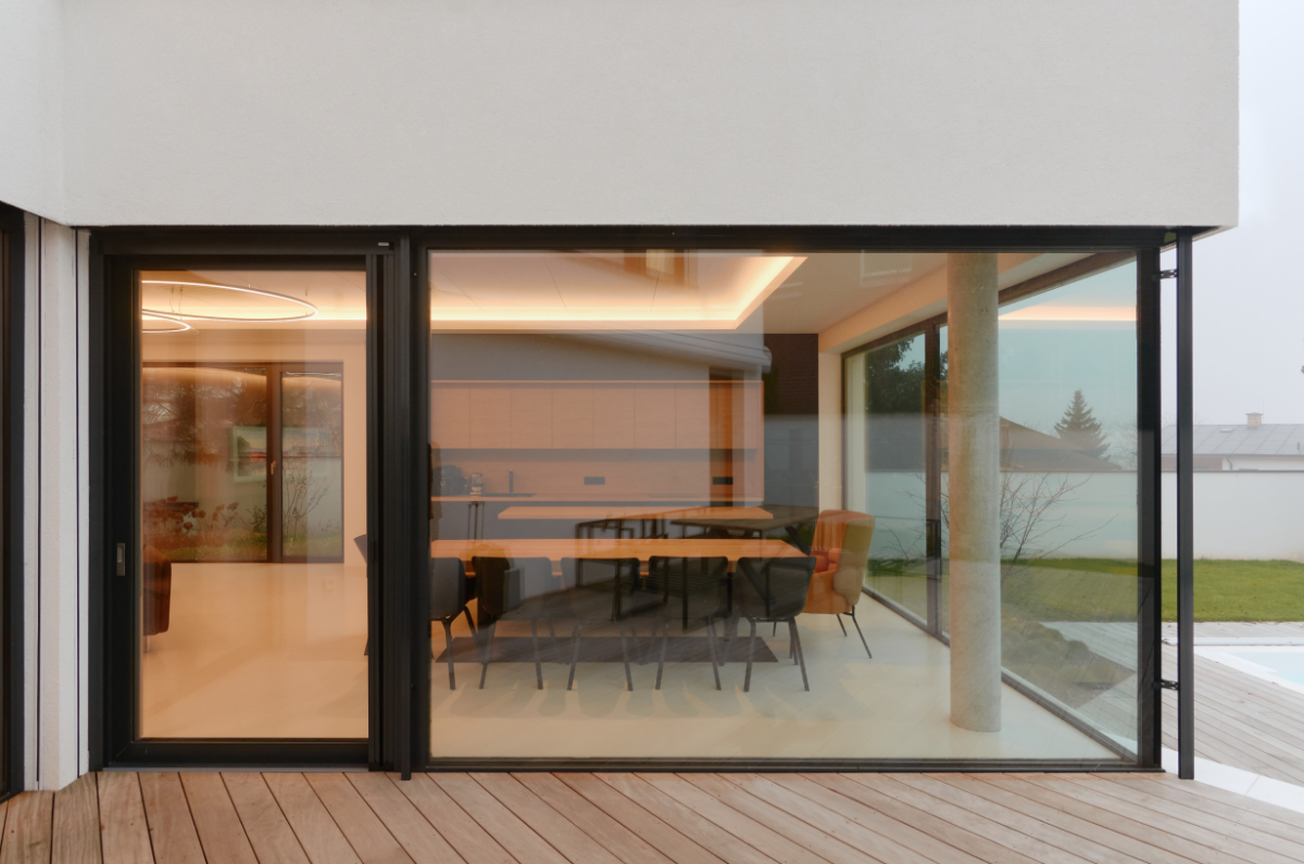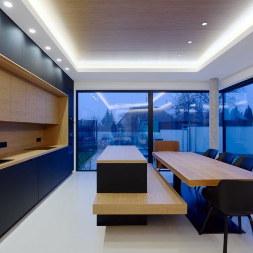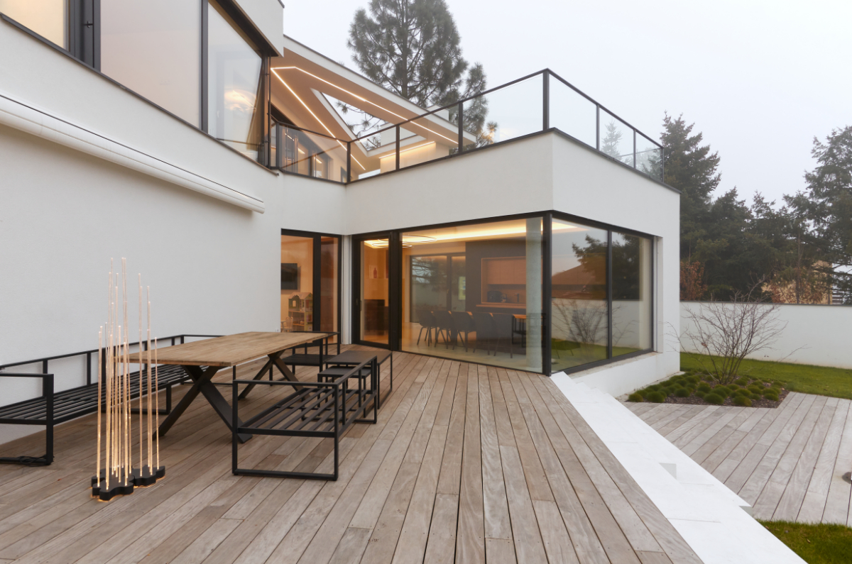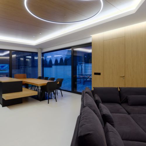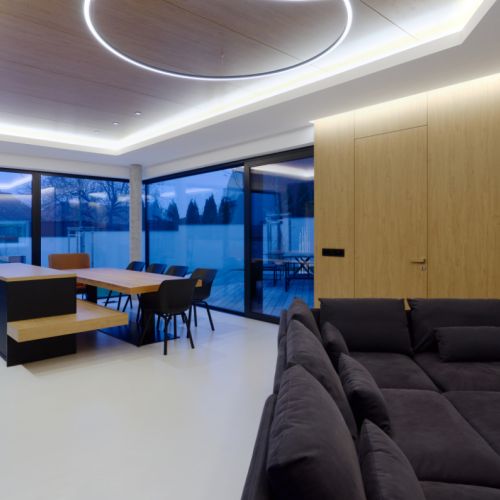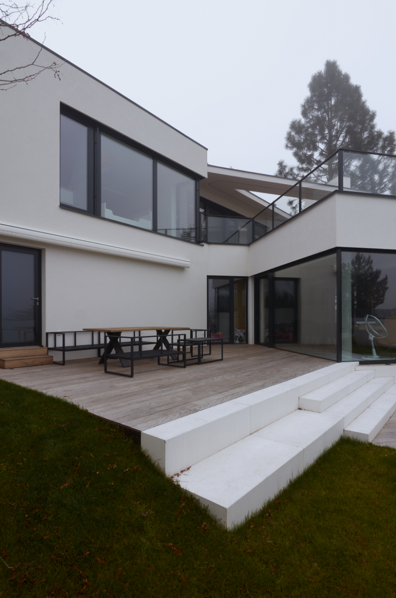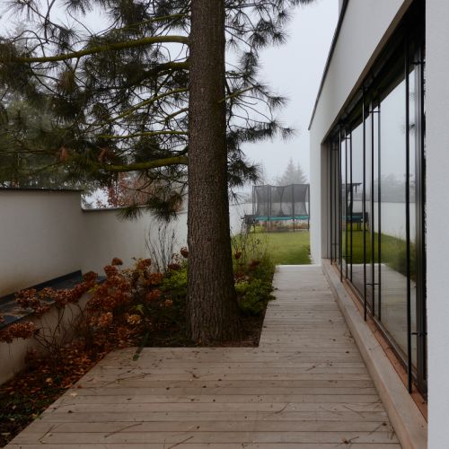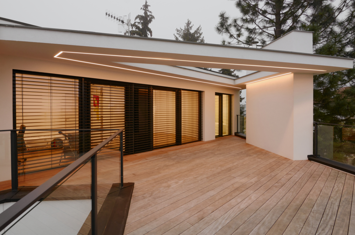 Moderní dvoupodlažní vila na rohové parcele v původní zástavbě Dolních Počernic navržená studiem Kareš&Rais. Na vile jsou kombinovány všechny moderní systémy ALUPROF, které se používájí pro rodinnou výstavbu v nízkoenergetickém standardu. Okna jsou vyrobeny z kvalitních, vysoce izolačních rámů MB-86SI v kombinaci s bezpečnostním izolačním trojsklem. S důrazem na design a ničím nerušený výhled ven byly okenní rámy v obývací části minimalizovány a částečně skryty. Všechny výplně jsou v exteriéru osazeny venkovními žaluziemi CLIMAX Z-90 NOVAL.