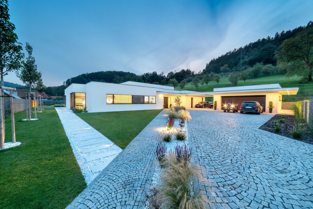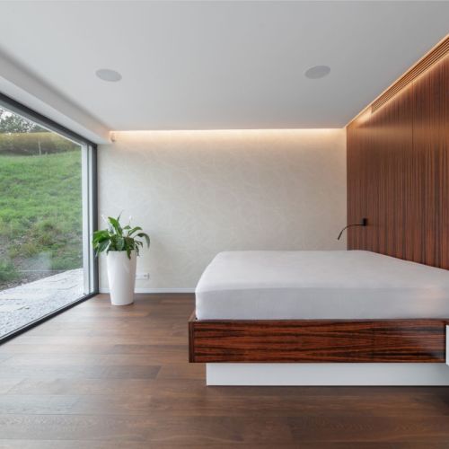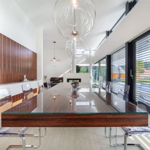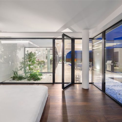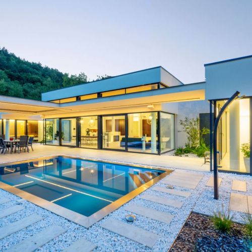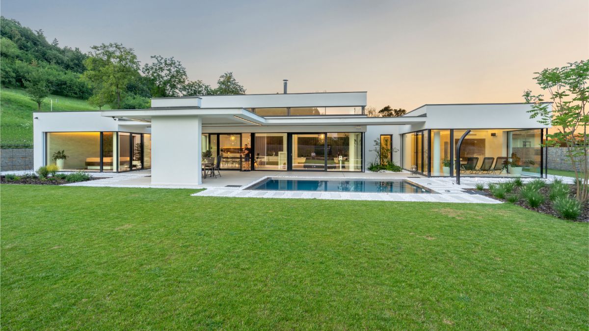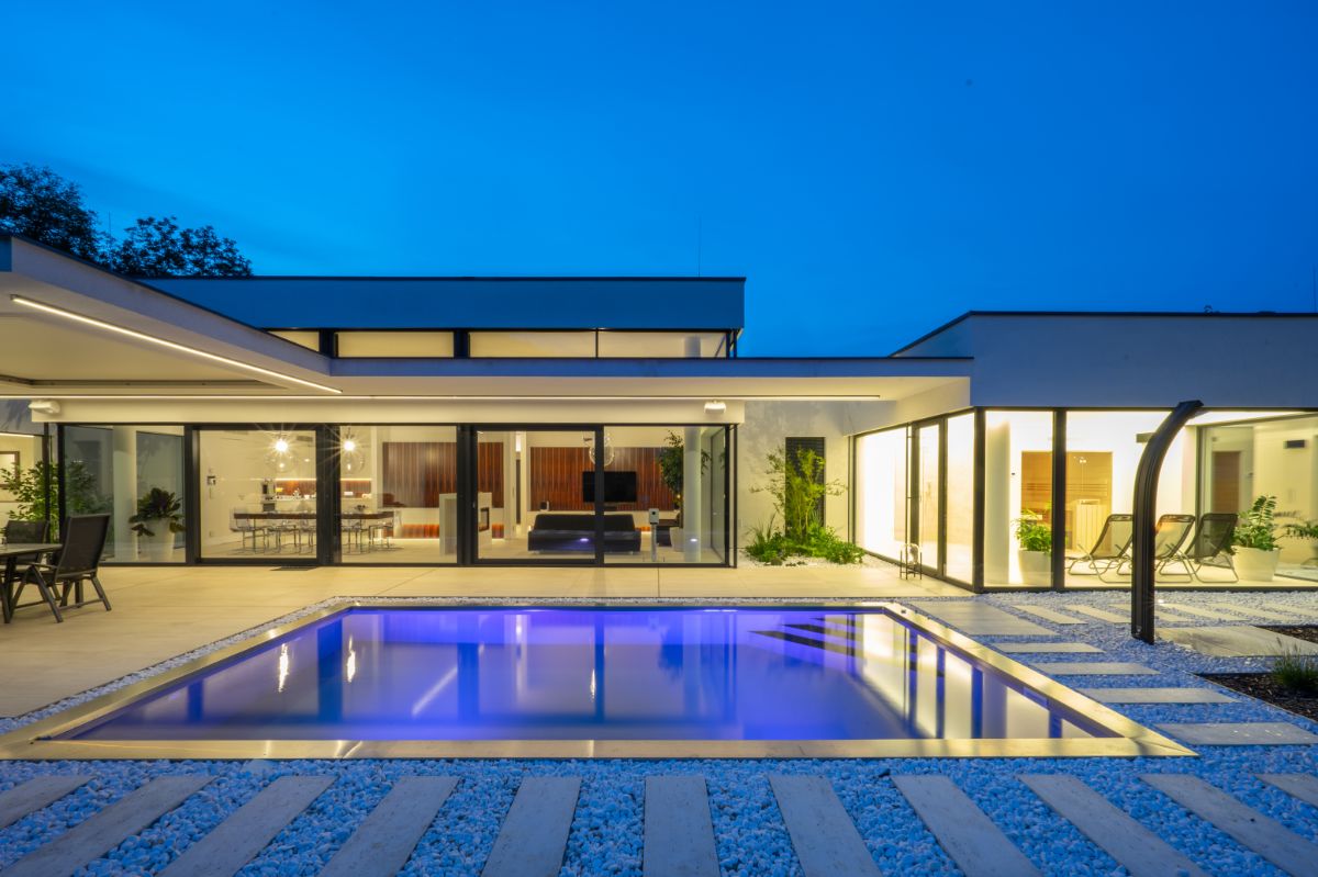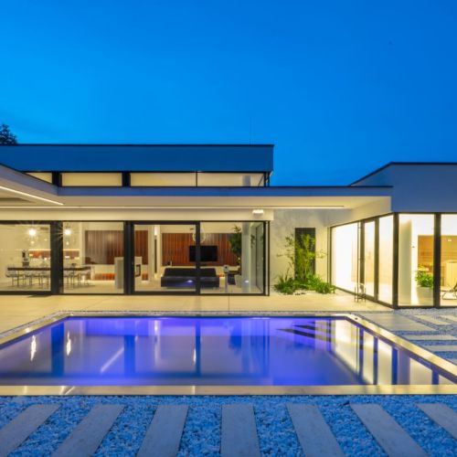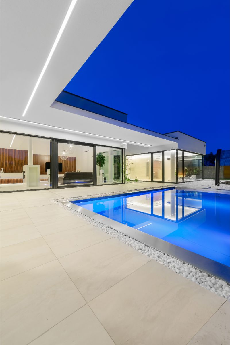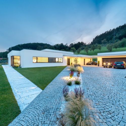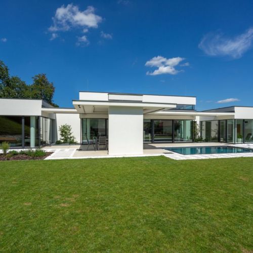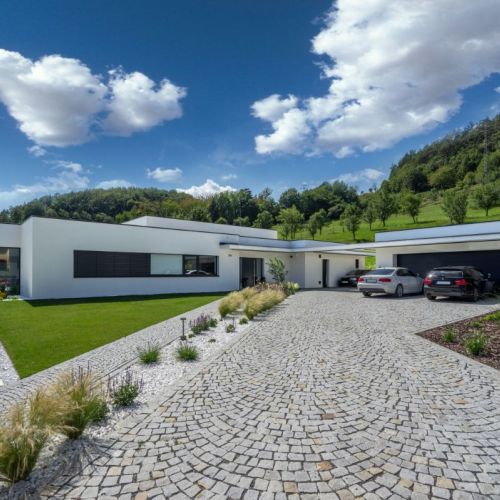 Krásná moderní prosklená vila postavená ve funkcionalistickém duchu v malé obci nedaleko Zlína navržená ateliérem Kareš&Rais tak, aby zapadla do venkovského prostředí. Vila ve tvaru písmene E se skládá ze tří bloků oddělených dvěma zelenými atrii. Všem částem domu dominují rozsáhlé prosklené plochy realizované za našich hliníkových systémů ALUPROF. Rámy oken tmavé čedičově černé barvy jsou minimalizovány či téměř skryty, díky tomu je výhled z interiéru téměř dokonalý.