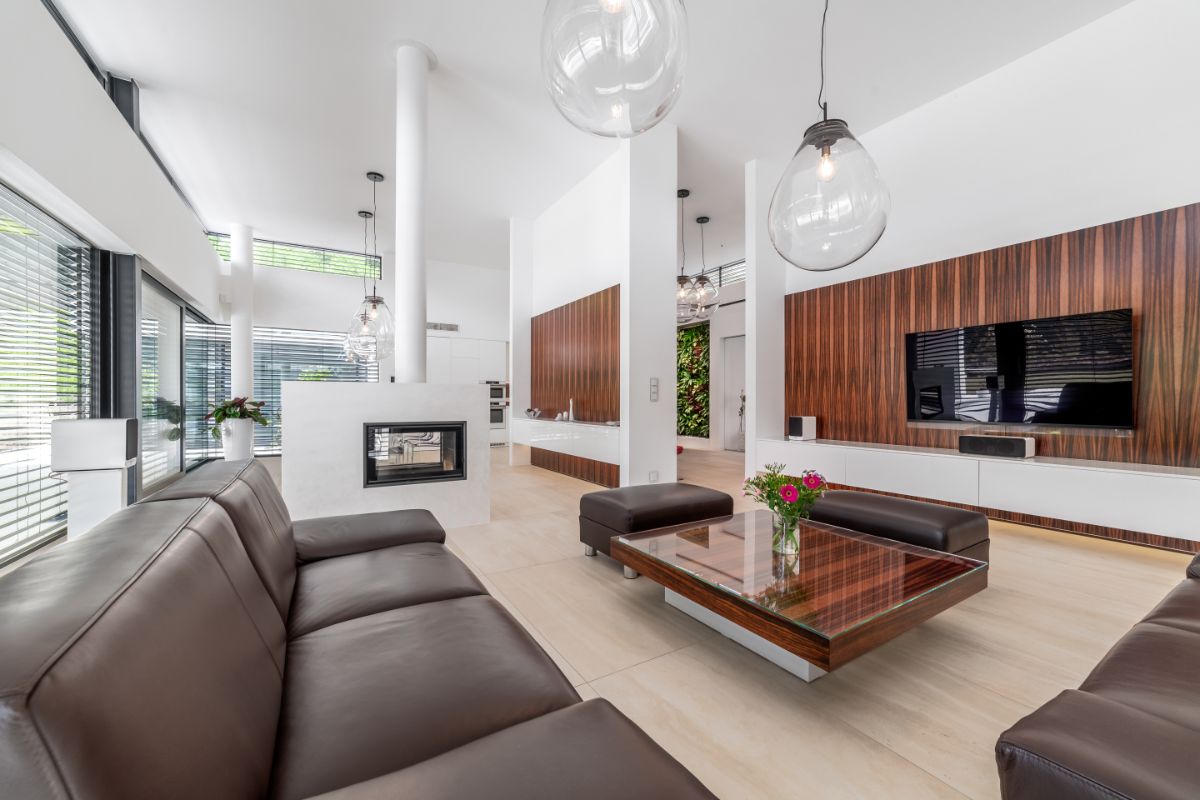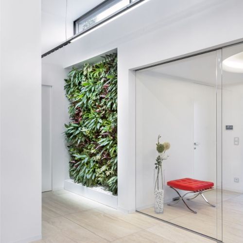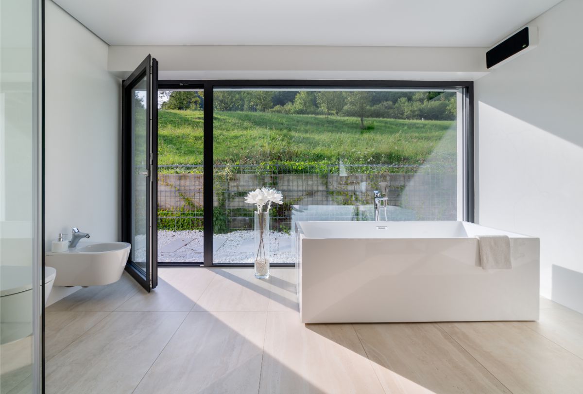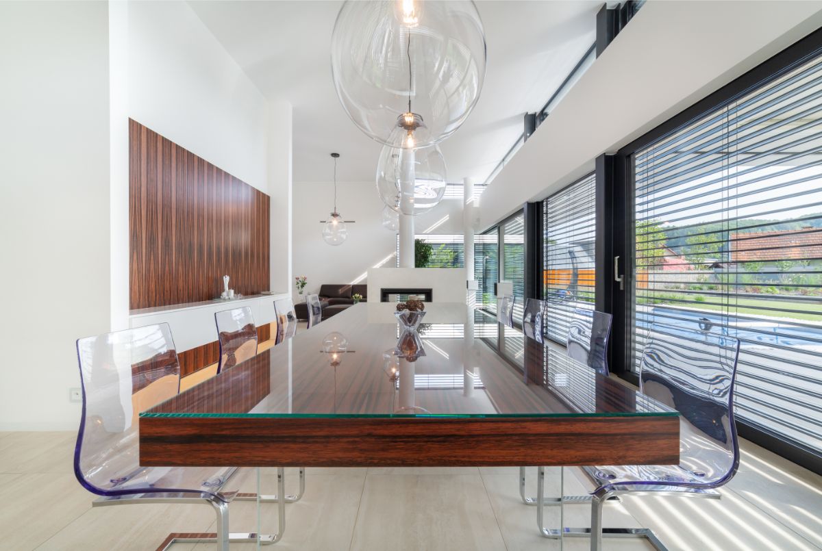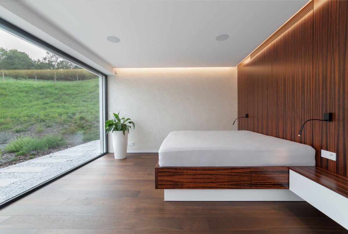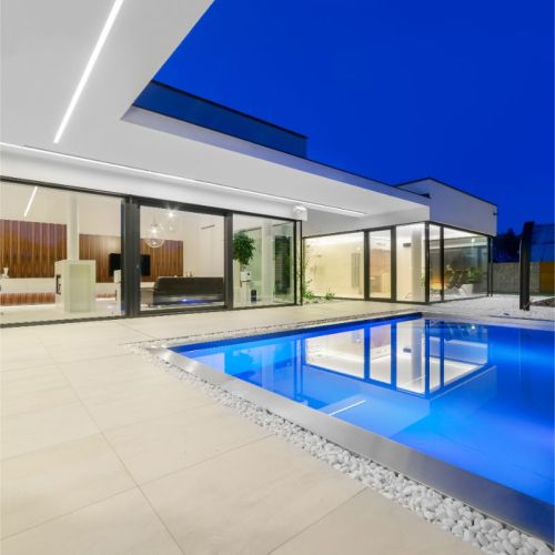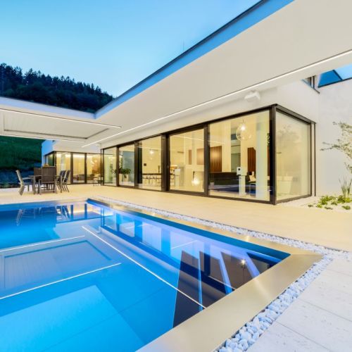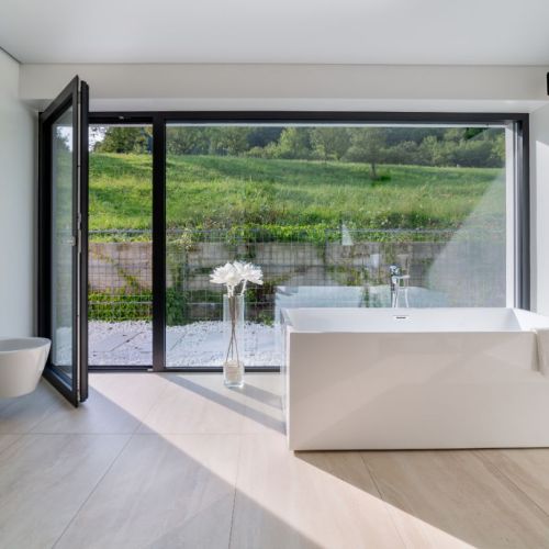 Krásná moderní prosklená vila postavená ve funkcionalistickém duchu v malé obci nedaleko Zlína navržená ateliérem Kareš&Rais tak, aby zapadla do venkovského prostředí. Vila ve tvaru písmene E se skládá ze tří bloků oddělených dvěma zelenými atrii. Všem částem domu dominují rozsáhlé prosklené plochy realizované za našich hliníkových systémů ALUPROF. Rámy oken tmavé čedičově černé barvy jsou minimalizovány či téměř skryty, díky tomu je výhled z interiéru téměř dokonalý.
