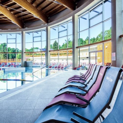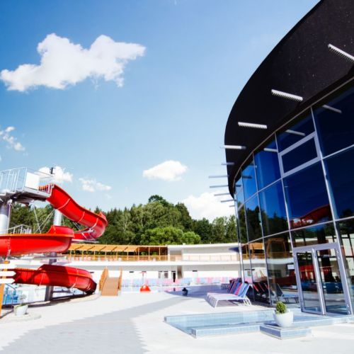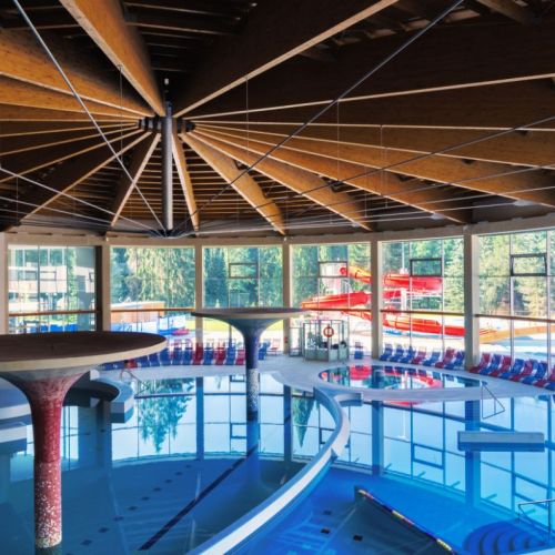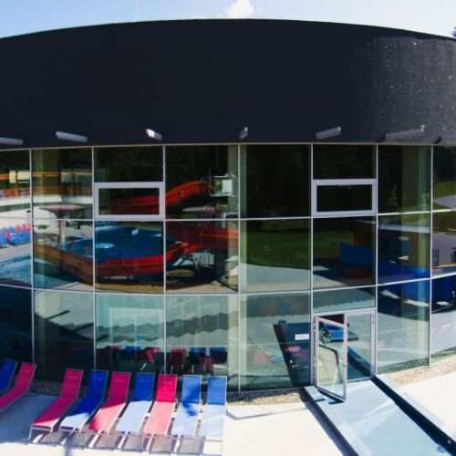 Námi dodávané prosklené fasády ALUPROF s velkoplošnými skly jsou výraznou dominantou hlavní bazénové haly. Pro použití v prostředí s agresivní vodou musely být všechny profily ošetřeny speciální epoxidovou povrchovou úpravou, kterou používáme například i v přímořských oblastech.