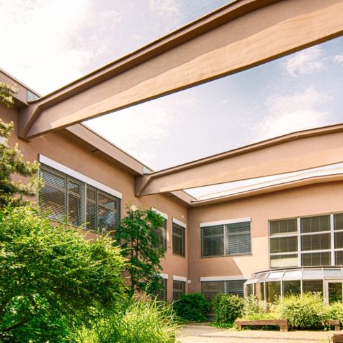 Další součástí byla také prosklená fasáda vstupu do budovy, která přechází do prosklené pultové střechy a taktéž vyžadovala složité atypické řešení odvodnění vody ze střechy.